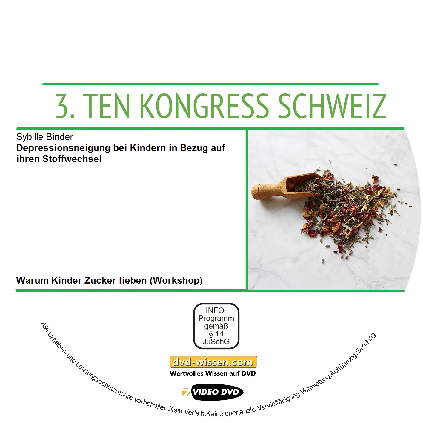 11 Video-DVDs; Spieldauer: ca. 19 Std. 44 Min., davon ca. 43 Min. Vortrag „Sybille Binder: Depressionsneigung bei Kindern in Bezug auf ihren Stoffwechsel“, ca. 1 Std. 31 Min. Workshop „Sybille Binder: Warum Kinder Zucker lieben“, Vortrag von Janine Lüscher ca. 35 Min., Vortrag von George-Henry Oertle ca. 32 Min., Vortrag von Patrick Engels ca. 47 Min., Vortrag von Pius Sigrist ca. 31 Min., Vortrag von Manfred Stümpfl ca. 30 Min., Vortrag von Dorothee Ogroske ca. 31 Min., Vortrag von Melanie Balmer ca. 33 Min., Vortrag von Chantal Rechsteiner ca. 26 Min., ca. 50 Min. Vortrag von Cornelia Reichlin, ca. 43 Min. Vortrag von Claudia Bachmann, ca. 1 Std. 32 Min. Vortrag von Olaf Rippe, ca. 1 Std. 41 Min. Vortrag von Dr. Martin Straube, ca. 4 Std. 57 Min. Vortrag „Die naturheilkundliche Kinderapotheke“ von Margret Madejsky, ca. 48 Min. Vortrag „Dr. Wighard Strehlow: Heilbarkeit der Unheitbarkeit“, ca. 57 Min. Vortrag „Dr. Wighard Strehlow: Kinderheilkunde mit Schwerpunkt von Allergiebehandlung nach Hildegard von Bingen“, ca. 1 Std. 35 Min. Vortrag „Das unruhige Kind“ von Margret Madejsky; Format: 16:9, gefilmt mit 2 Kameras